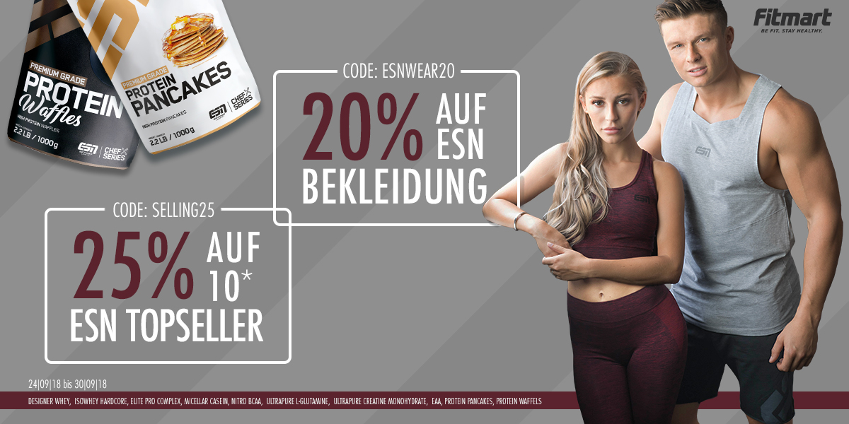Zur Zeit gibt es bei der Firma Fitmart mit dem Motto „Be Fit. Stay Healthy“ eine Rabattaktion mit ESN-Produkten, bei der es bis zu 25% Rabatt auf alle ESN-Topseller, und bis zu 20% Rabatt auf ESN-Bekleidung.