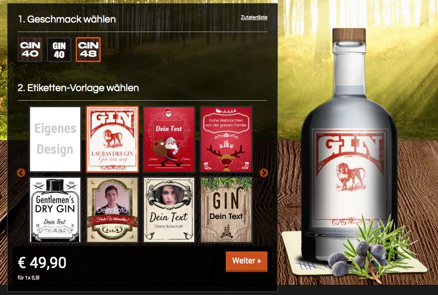 Ab sofort kannst du in der Braufabrik deinen Gin selbst personalisieren lassen. Erstmal wählt ihr eine Flasche aus. Von einer klassischen Apothekerflasche bis zur quadratischen Designflasche ist für jeden Geschmack was dabei. Mit wenigen Klicks kannst du jetzt noch dein Etikett gestalten.