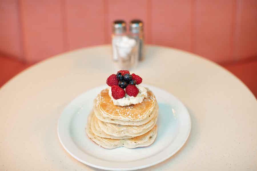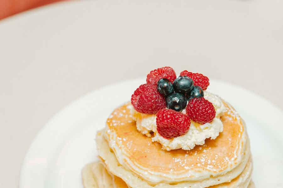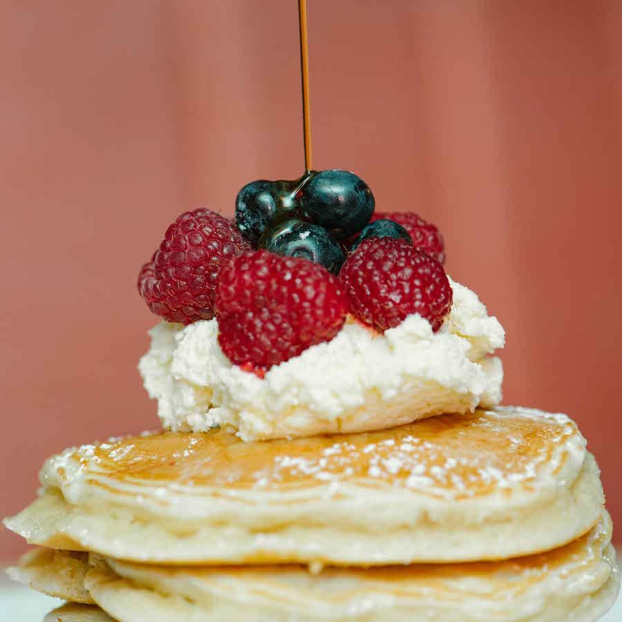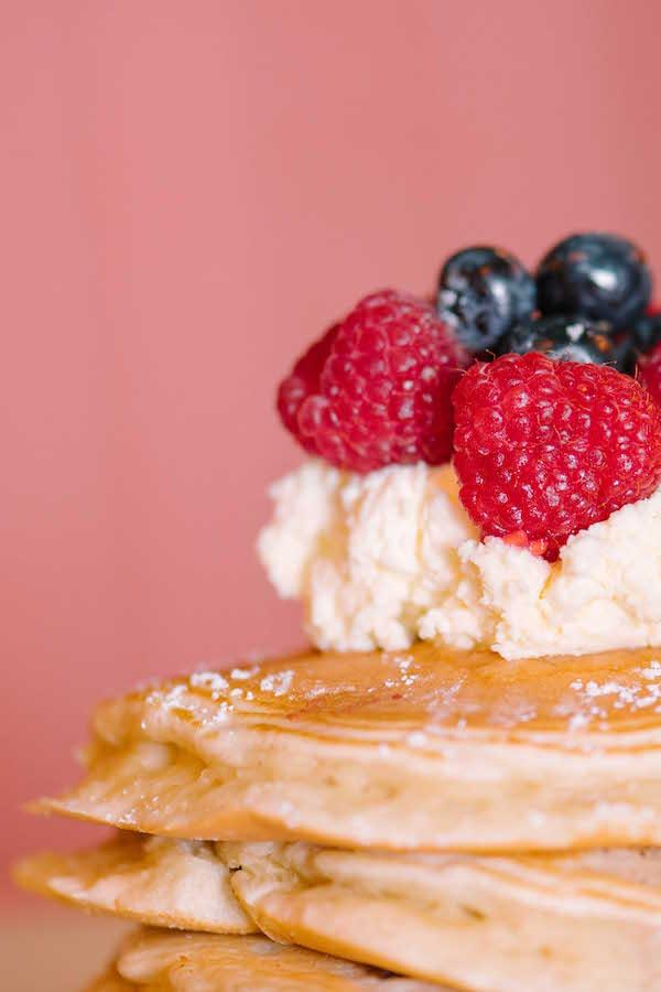 Amerikanische Pfannkuchen mit Himbeeren, Heidelbeeren und Sahne, vor einem rosa Hintergrund.