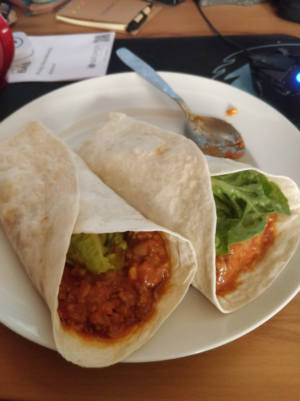 Zwiebeln und Hack anbraten, anschließend die Tomaten und die Gewürze dazu. Das ganze köcheln lassen, bis die Flüssigkeit verdampft ist. In einer Mikrowelle eine Tortilla leicht erwärmen, dann die Füllung mittig verteilen, anschließend kommt Guacamole und ein Salatblatt darauf und der Burrito wird eingewickelt. Fertig. Lasst es euch schmecken! 😉