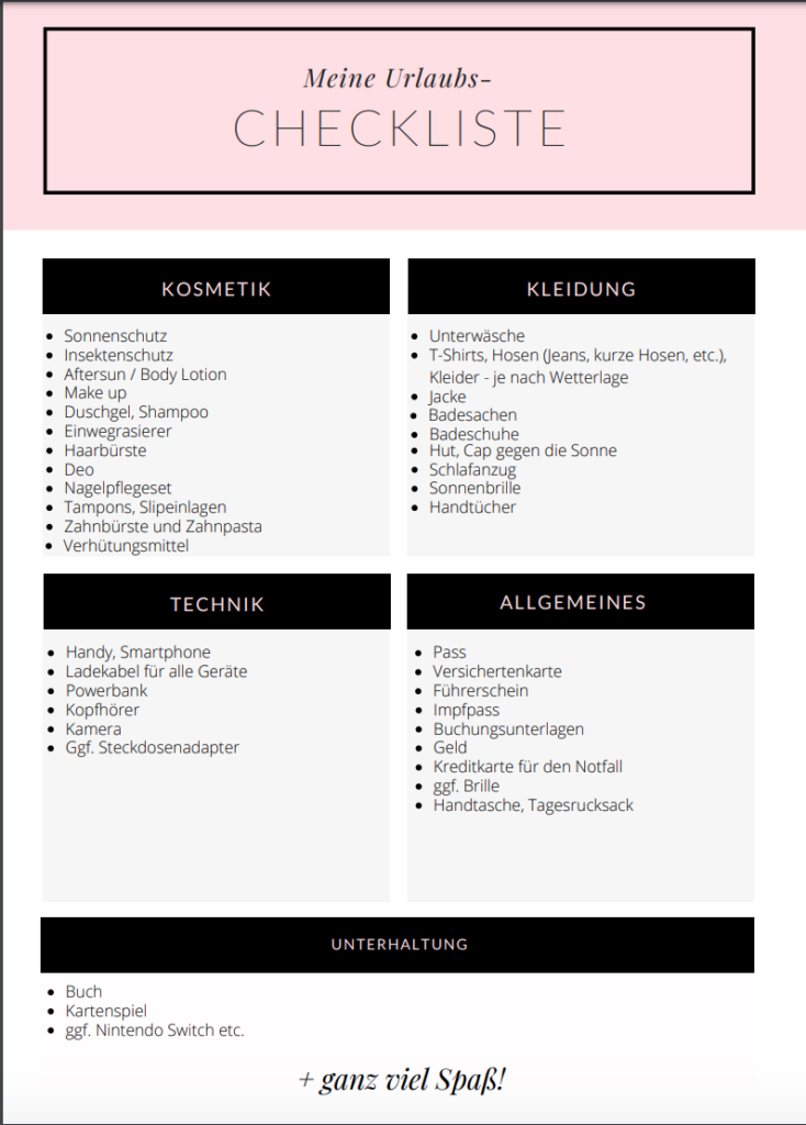 Einfach unsere Urlaubs-Checkliste aus diesem Beitrag downloaden. Natürlich könnte ihr sie auch ausdrucken und bequem alle Punkte nacheinander abhaken.