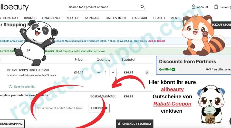 Mit den exklusiven Gutscheinen von Rabatt-Coupon 🐼 spart ihr noch mehr! So funktioniert’s:- Gutschein finden: Sucht euch bei Rabatt-Coupon 🐼 einen passenden Allbeauty Rabattcode aus.