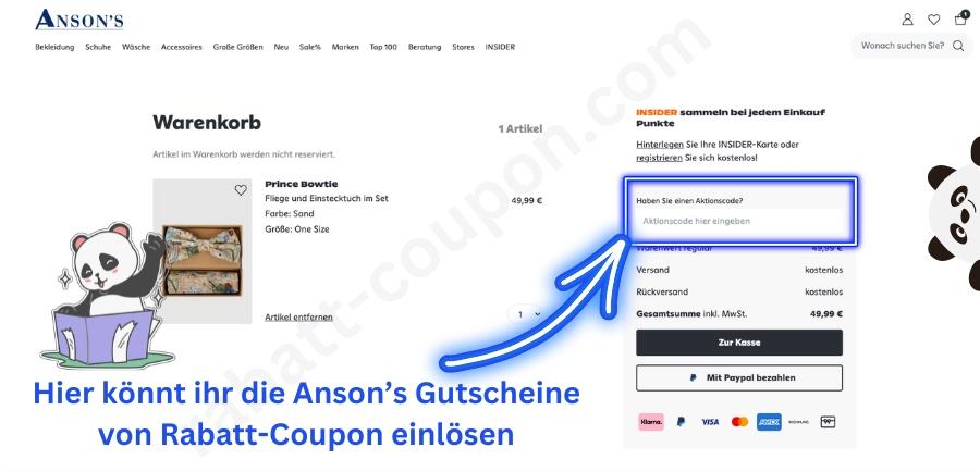 - 🐼 Gutscheine und Rabattcodes: Ihr könnt Gutscheine oder Rabattcodes nutzen, um bei eurem Einkauf bei Anson's einen Preisvorteil zu erhalten.