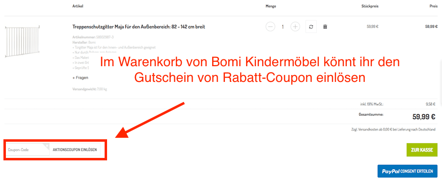 Egal ob ein Gutschein oder eine Aktion, ihr bekommt mit diesen entweder einen Rabatt, gratis Versand oder auch gratis Artikel im Bomi Kindermöbel Shop. Der einzige Unterschied der Angebote bei Bomi Kindermöbel ist, dass ein Gutschein immer einen zugehörigen Gutscheincode enthält, der bei jedem Bomi Kindermöbel Gutschein variiert. Den Code entnehmt ihr bitte immer eurem gewünschten Bomi Kindermöbel Gutschein. Eine Bomi Kindermöbel Aktion benötigt keinen Gutscheincode, um eingelöst zu werden. Ein Rabatt, gratis Versand oder gratis Artikel ist meist den Artikeln schon beigefügt oder wird automatisch in eurem Warenkorb bei Bomi Kindermöbel hinzugefügt. Das Angebot bei Bomi Kindermöbel wechselt ständig, weshalb wir euch immer auf dem Laufenden halten, welcher Gutschein und welche Aktion im Moment aktuell ist.Wie ihr einen Gutschein oder eine Aktion bei Bomi Kindermöbel anwendet: