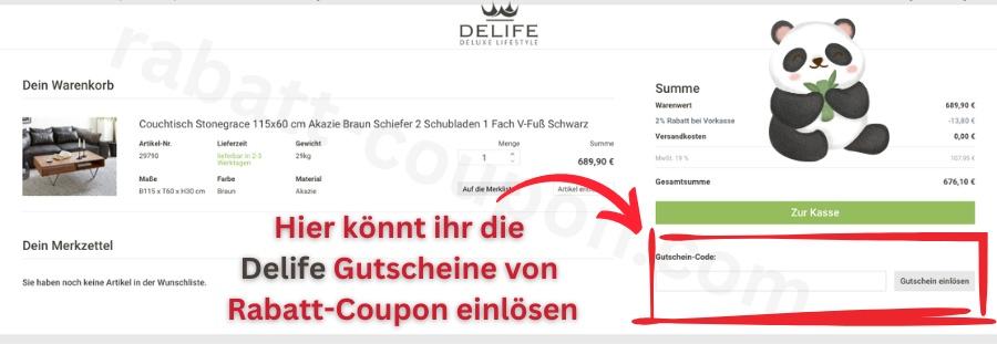 Am Ende des Bestellvorgangs den DeLife Gutscheincode eingeben.