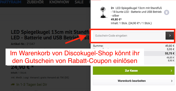 Einfach dem Link folgen, den Gutscheincode von Discokugel-Shop eintragen und zugreifen.