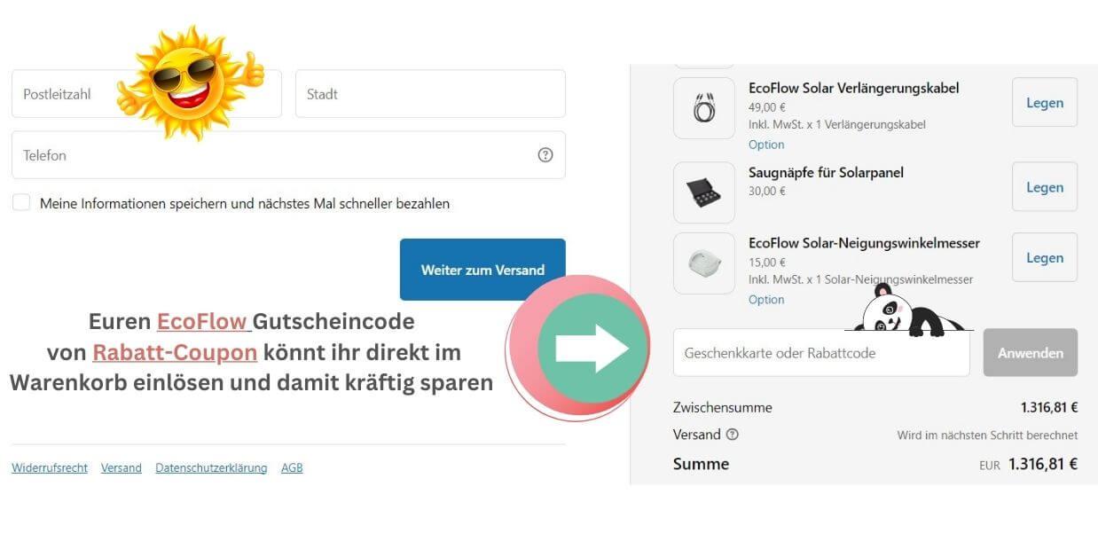 - Geht zur Kasse und gebt den EcoFlow Gutscheincode in das entsprechende Feld ein.