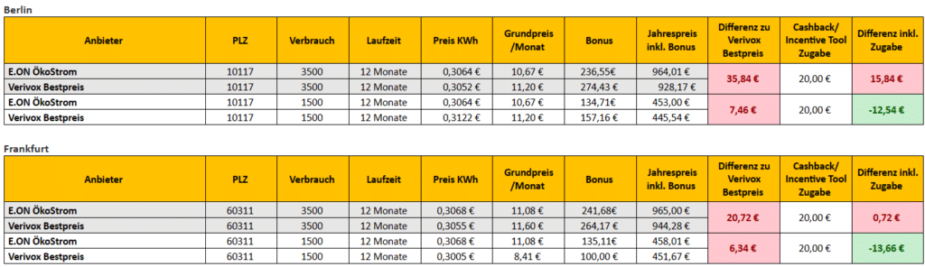 Differenz zu Verivox Bestpreis | Cashback/ Incentive Tool Zugabe | Differenz inkl. Zugabe |