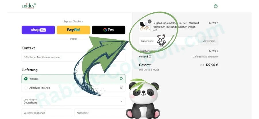 Erides akzeptiert American Express, Apple Pay, Google Pay, Klarna, Maestro, Mastercard, PayPal, Shop Pay, Union Pay und Visa. Entscheidet ihr euch für klassische Vorab-Überweisung, erhaltet ihr 2 % Sofortrabatt – ein kleiner, aber sicherer Preisvorteil. Alle Transaktionen laufen über SSL-verschlüsselte Shopify-Payment-Schnittstellen, sodass eure Karten- oder Kontodaten geschützt bleiben. Pro: große Auswahl inkl. Ratenzahlung via Klarna, Zusatzrabatt für Vorkasse. Contra: Rechnungskauf ohne Klarna wird nicht angeboten. 💳 (erides.de)4. Anleitung zum Einlösen von einem Erides Gutschein