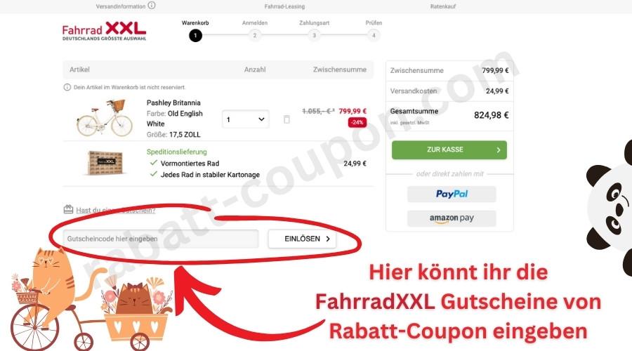 Eine Aktion bei Fahrrad-XXL benötigt zum Einlösen keinen Gutscheincode. Die Aktion passend zu eurer Bestellung findet ihr ebenfalls auf unserer Website www.rabatt-coupon.com. Eine Aktion wie z.B. ein Rabatt, gratis Versand und gratis Artikel wird direkt bei eurer Bestellung im Fahrrad-XXL Shop angewendet. Ihr müsst also nichts tun, um zu sparen.Details zu euren Zahlungsmöglichkeiten bei Fahrrad-XXL: