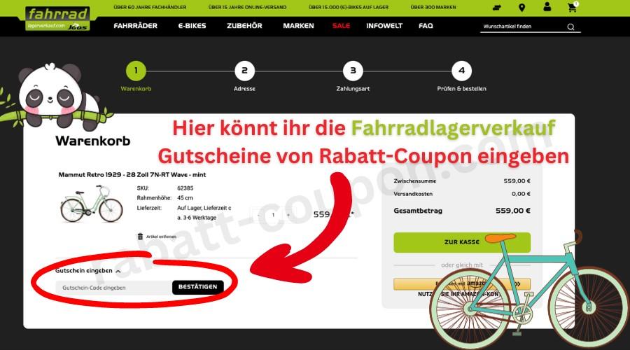Einfach den Fahrradlagerverkauf.com Gutscheincode im Bestellprozess eingeben und sparen.
