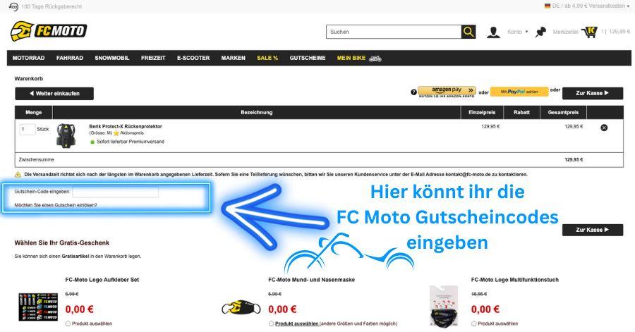 Einfach den FC-Moto.de Gutscheincode im Bestellprozess eingeben und sparen.
