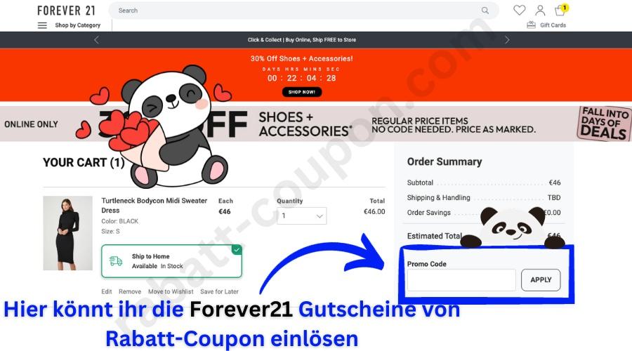🐼 Mit dem neuesten Forever 21 Gutschein erwartet euch eine fantastische Gelegenheit, eure Garderobe aufzufrischen! 🚚 Erhaltet einen großzügigen Rabatt von bis zu 90 % auf ausgewählte Stile + 50 % EXTRA, wenn ihr den Code an der Kasse eingebt. 🚚