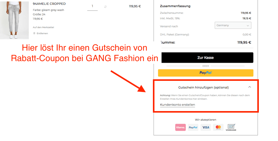Lieblingsjeans aussuchen, im Warenkorb den GANG Code eintragen und der Rabatt wird direkt abgezogen.