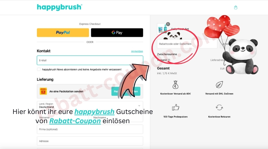 Im Warenkorb könnt ihr den happybrush-Gutscheincode von Rabatt-Coupon einlösen.