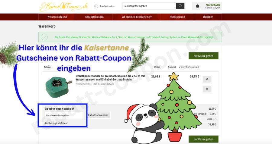 Das Bild zeigt den Warenkorb von Kaisertanne mit einem Premium Nordmanntannen Weihnachtsbaum im Wert von 66,66 €. Rechts in der Zusammenfassung ist das Feld zur Eingabe des Gutscheincodes deutlich markiert. Mehrere Panda-Illustrationen sind dekorativ im Bild eingefügt.