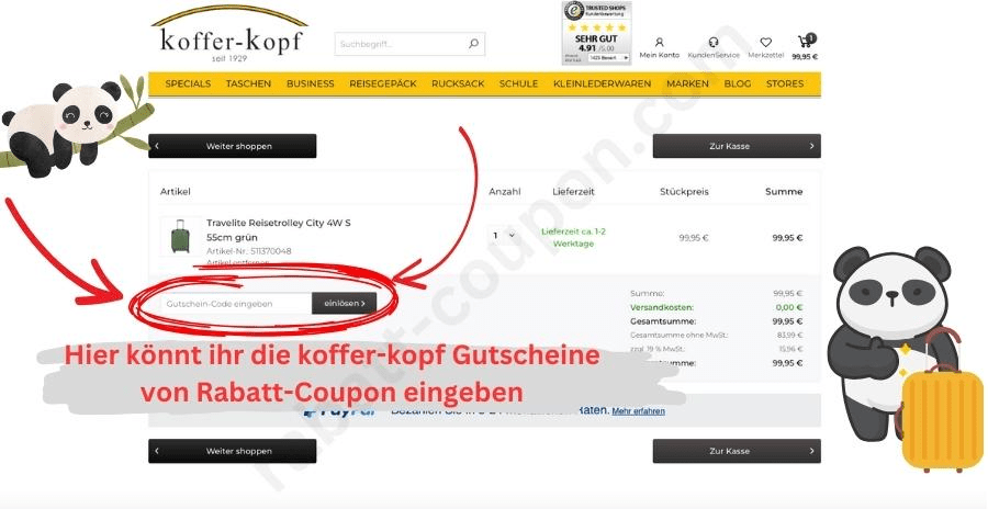 - 🐼 Kundenservice kontaktieren: Wenn Ihr alle Schritte überprüft habt und der Gutscheincode immer noch nicht funktioniert, kontaktiert den Kundenservice von Koffer-Kopf. Sie können Euch bei der Lösung des Problems helfen.