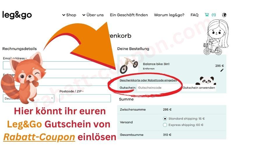 🔹 Einfach den Leg&go Gutscheincode an der Kasse einfügen
