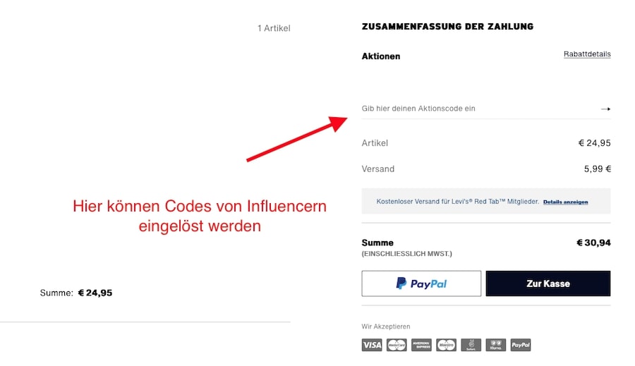 Levi’s Gutschein einlösen im Warenkorb. So gehts Screenshot mit Panda und Pfeil.