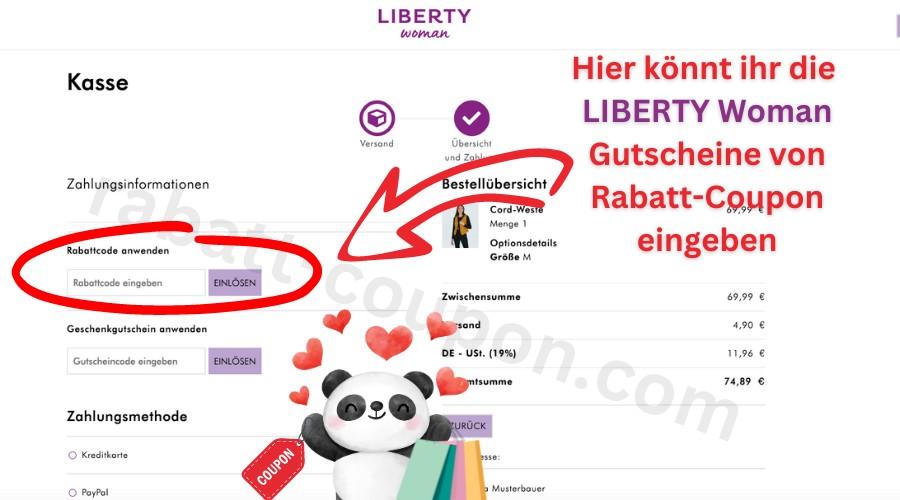 Um von einem LIBERTY Woman Gutschein zu profitieren, gebt den Gutscheincode während des Bestellvorgangs im Online-Shop ein. Hier ist eine Schritt-für-Schritt Anleitung, wie ihr euren LIBERTY Woman Gutschein einlösen könnt: