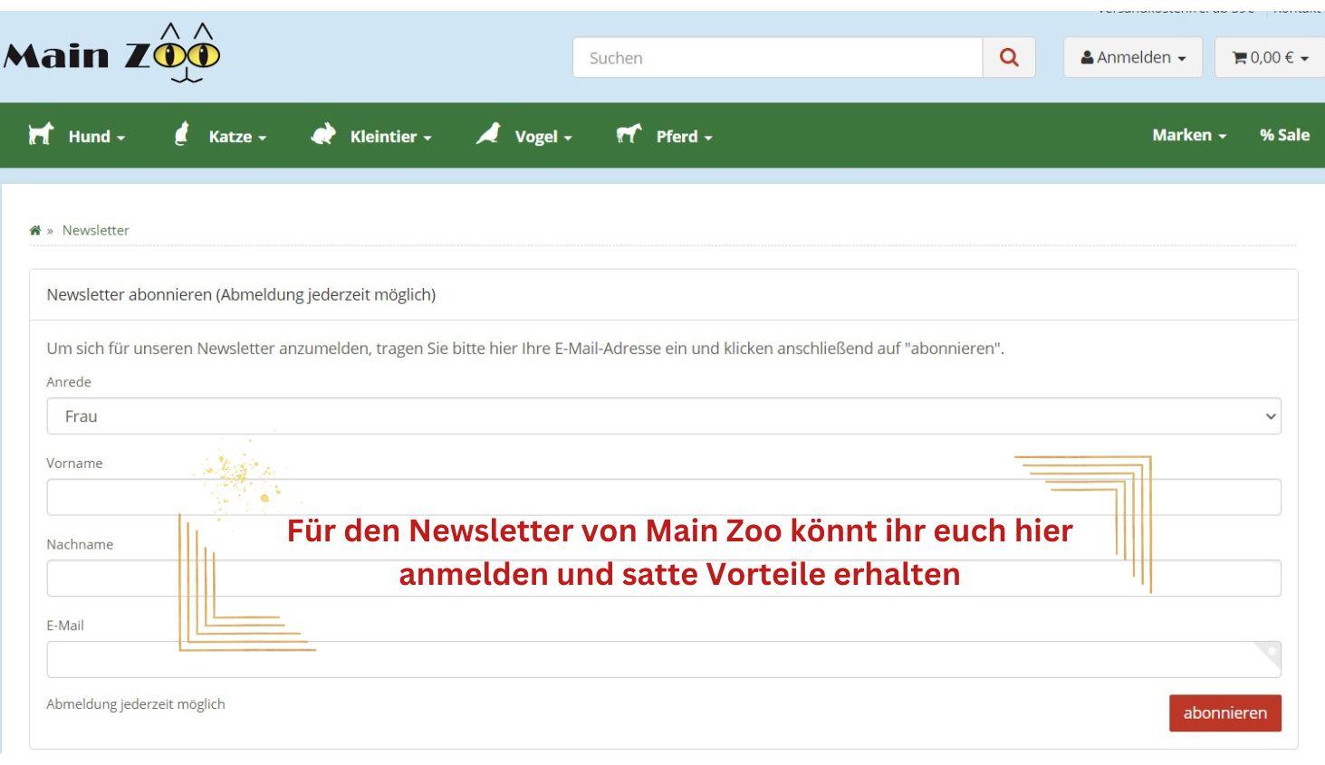 - Setzt das Häkchen im Feld darunter und klickt auf senden. Schon seid ihr beim Newsletter angemeldet und erhaltet alle Angebote von Main Zoo.