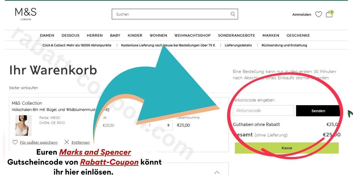 4. Gutscheincode eingeben: Seht nach dem Feld "Gutscheincode" und tragt euren Marks and Spencer Gutscheincode ein. Mit einem Klick bestätigt ihr eure Eingabe.
