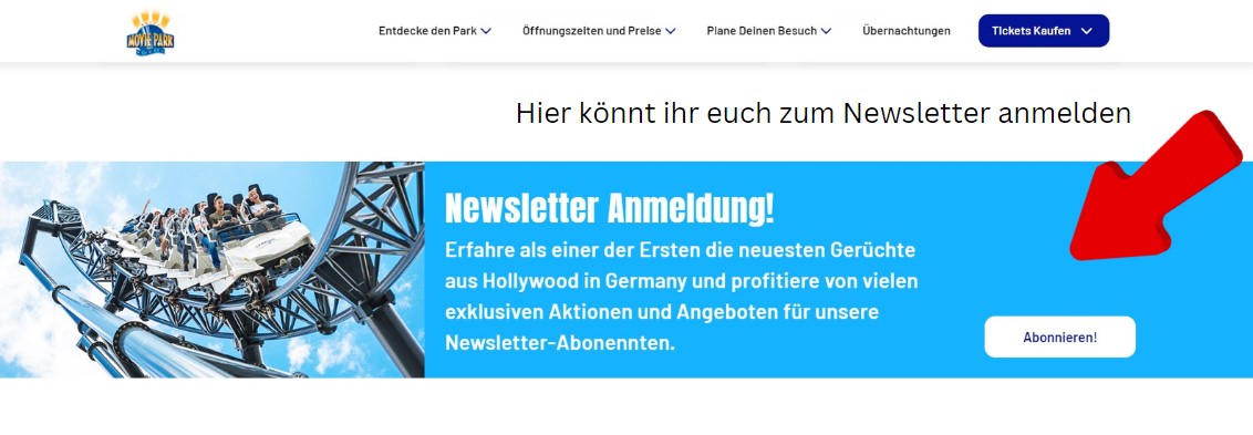 Meldet euch doch auf der Movie Park Holidays Website zum Newsletter an und erhaltet top Neuheit, Rabatt, Aktion und Gewinnspiel immer als Erstes. Zudem bekommt ihr als Movie Park Holidays Newsletter Abonnent exklusive Angebote, die nur durch den Newsletter erhältlich sind.
