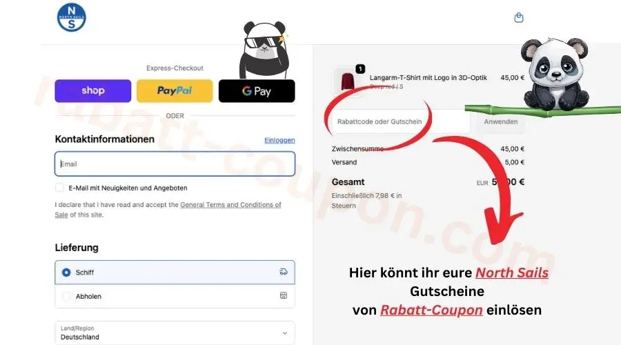 An der Kasse muss nur noch der North Sails Gutscheincode eingegeben werden. Profitieren kann jeder Neu- und Bestandskunde