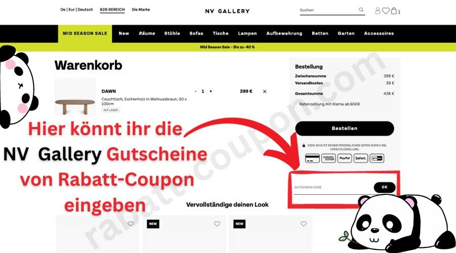 Eine Aktion bei NV Gallery benötigt zum Einlösen keinen Gutscheincode. Die Aktion passend zu eurer Bestellung findet ihr ebenfalls auf unserer Website www.rabatt-coupon.com. Ihr müsst zum Anwenden der gewünschten Aktion von NV Gallery nur auf das Feld „KLICKEN UM EINZULÖSEN“ tippen, um zum NV Gallery Shop weitergeleitet zu werden. Dort erhaltet ihr euren Vorteil zu eurer Bestellung, ohne etwas dafür zu tun.Worauf könnt ihr mit einem NV Gallery Gutschein oder Aktion sparen: