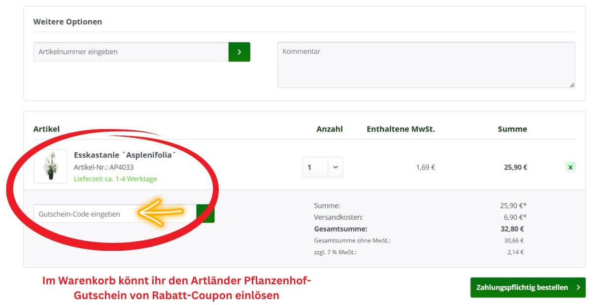 - Erfüllt ein Produkt im Warenkorb nicht die Bedingungen des Gutscheins? Die Bedingungen zum Einlösen eines Gutscheins von Artländer Pflanzenhof entnehmt ihr bitte immer dem Infotext, der dem Gutschein beigefügt ist.