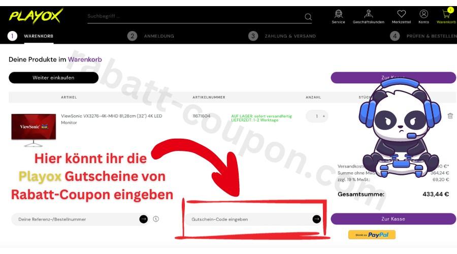 - 🐼 Gebt den Playox Gutscheincode beim Checkout ein.