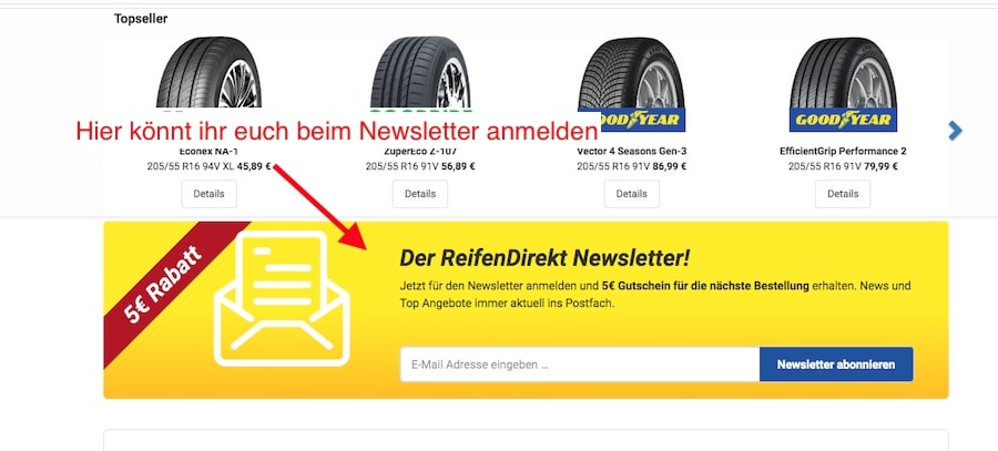 Details, um mit dem ReifenDirekt Newsletter zu sparen: