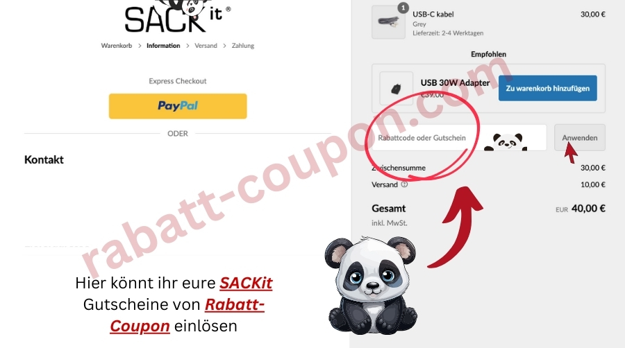 Einfach unserem Link folgen, den SACKit Gutscheincode im Bestellprozess eingeben und sparen.