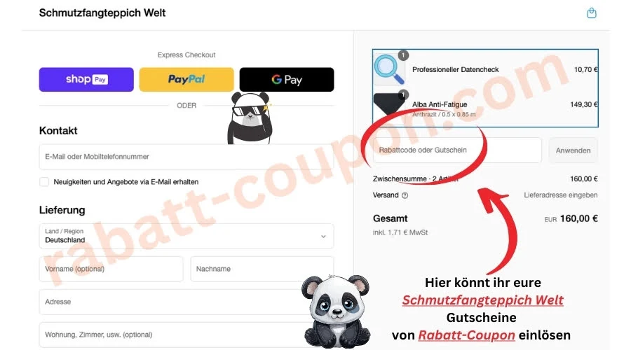 Bei Schmutzfangteppich Welt stehen euch zahlreiche sichere Zahlungsmöglichkeiten zur Verfügung. So könnt ihr ganz bequem per Visa, anderen Kreditkarten, PayPal, Klarna, Apple Pay oder Google Pay bezahlen. Das sorgt für maximale Flexibilität – ob klassische Überweisung oder modernes Mobile Payment. Alle Zahlungsarten werden verschlüsselt abgewickelt, damit ihr beim Online-Einkauf auf der sicheren Seite seid.Hat Schmutzfangteppich Welt Gutscheine, die mir weitere Rabatte bieten? 🎁