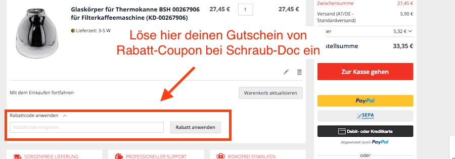 - Gutscheincode eingeben: Geht zum Warenkorb und sucht nach dem Feld "Gutscheincode" oder "Aktionscode". Gebt dort Euren Schraub-Doc Gutscheincode ein.