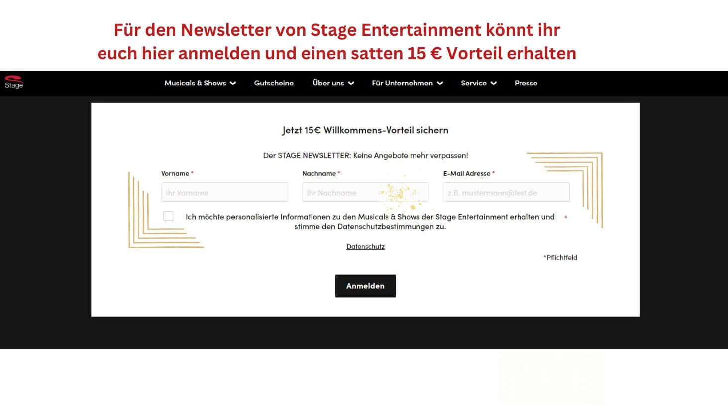 Meldet euch für den STAGE Entertainment Newsletter an und sichert euch 15 € Willkommens-Vorteil auf eure nächste Buchung. Erhaltet zudem regelmäßig exklusive Informationen zu Musicals, Shows und besonderen Angeboten.