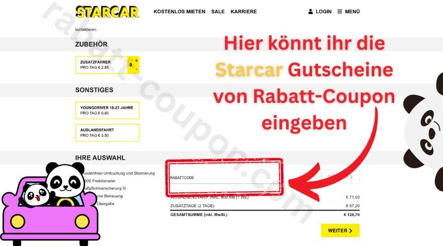 Mit einem STARCAR Rabattcode könnt ihr eure Ersparnisse optimieren. Das Einlösen eines Gutscheincodes ist unkompliziert und kann euch attraktive Vergünstigungen verschaffen. Hier ist eine Schritt-für-Schritt-Anleitung: