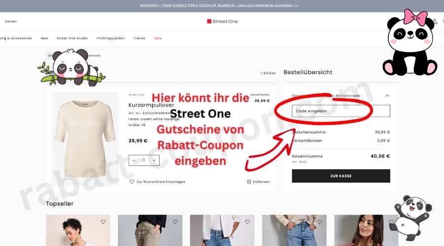 Einfach den Street One Gutscheincode im Bestellprozess eingeben und sparen.