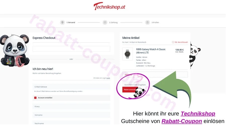 - Gutscheinfeld: Tragt den entsprechenden Rabattcode in das dafür vorgesehene Feld ein.