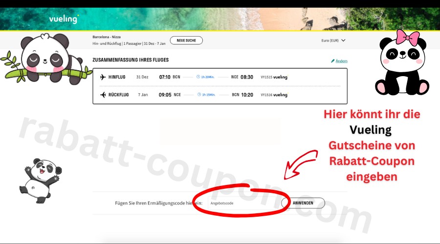 🛒️🐼 Der Vueling Gutscheincode öffnet die Tür zu unvergesslichen Erlebnissen. Folgt einfach unserem Link, löst den Gutscheincode an der Kasse ein und startet euer Abenteuer.