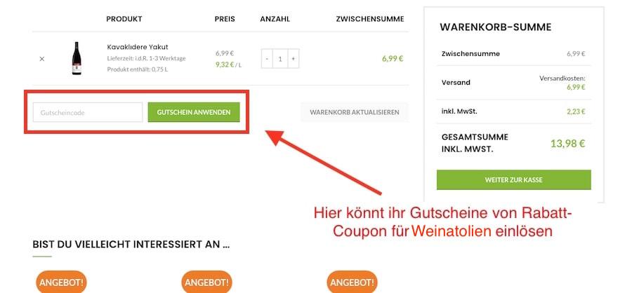 Nun den Weinatolien Gutscheincode an der Kasse eingeben und direkt sparen.