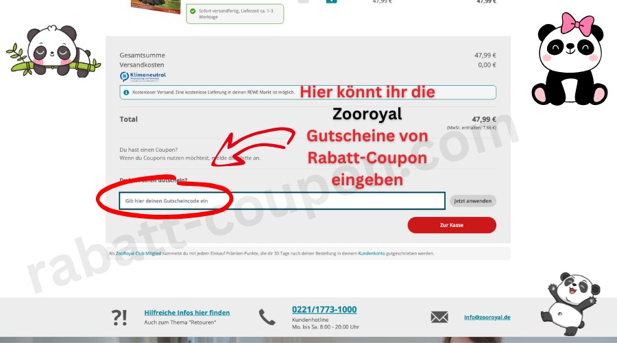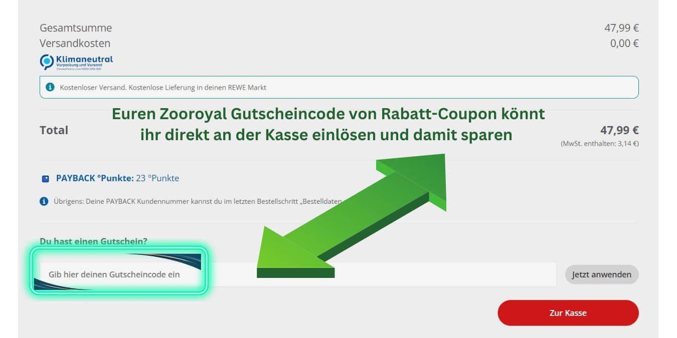 - Gebt Euren ZooRoyal Gutscheincode im entsprechenden Feld an der Kasse ein.
