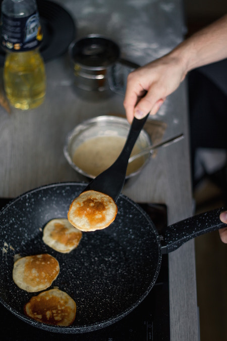 Mehl, Salz, Backpulver und Puderzucker in eine Schüssel geben. Alles vermischen und in die Mitte eine Vertiefung drücken. Eier und Milch in die Vertiefung geben und mit einem Schneebesen glattrühren. Die Butter schmelzen lassen und in den Teig einrühren, bis eine homogene Masse entsteht. Einen Teelöffel Öl in einer beschichteten Pfanne erhitzen. Eine kleine Kelle Teig hineingießen und den Pancake 2 Minuten braten lassen. Dann umdrehen und eine Minute weiterbraten lassen.