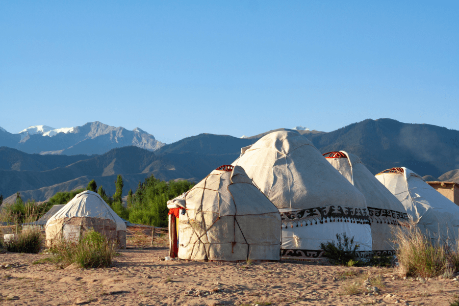 Jurten am Fuße des Tian Shan-Gebirges.